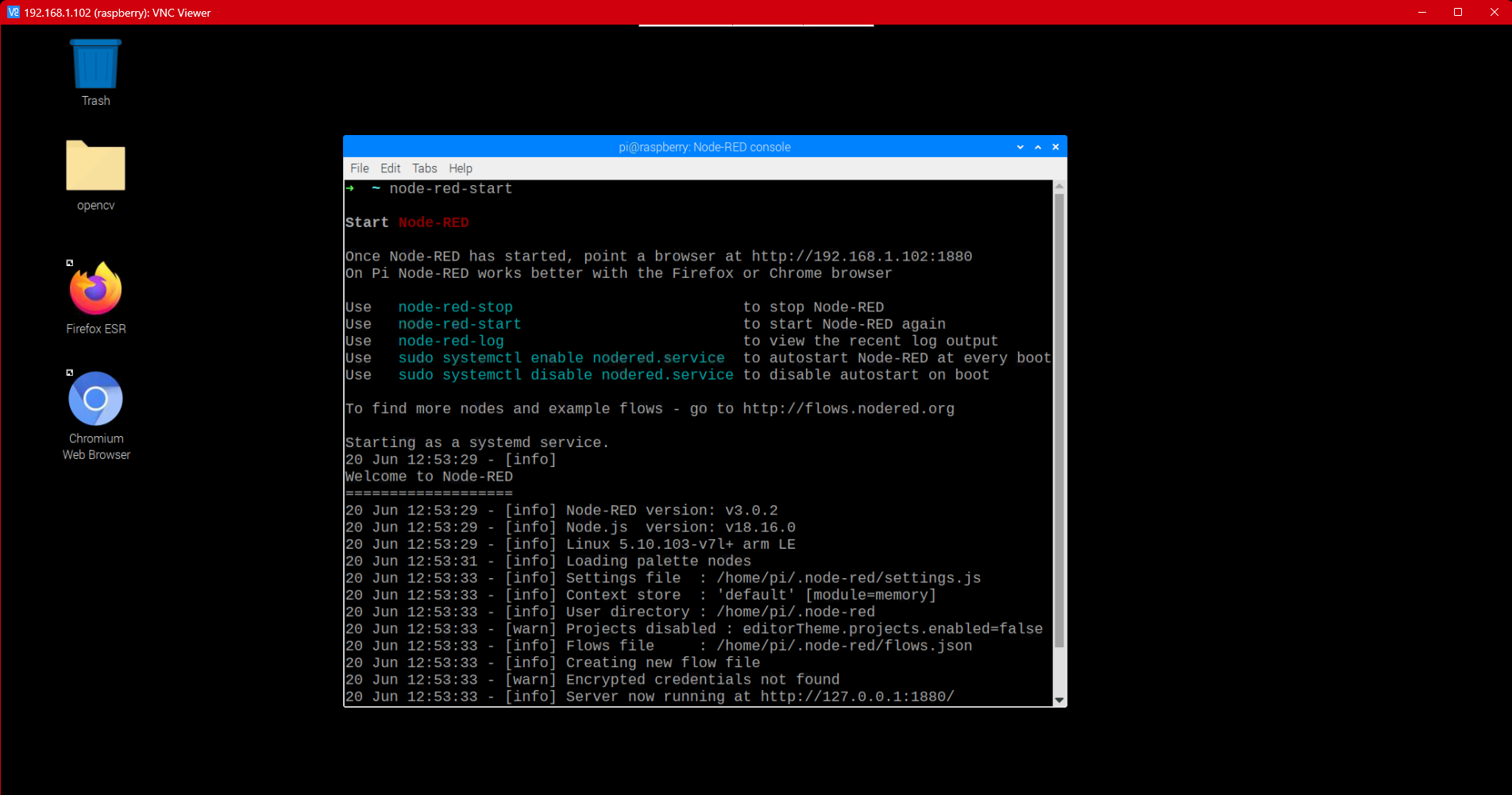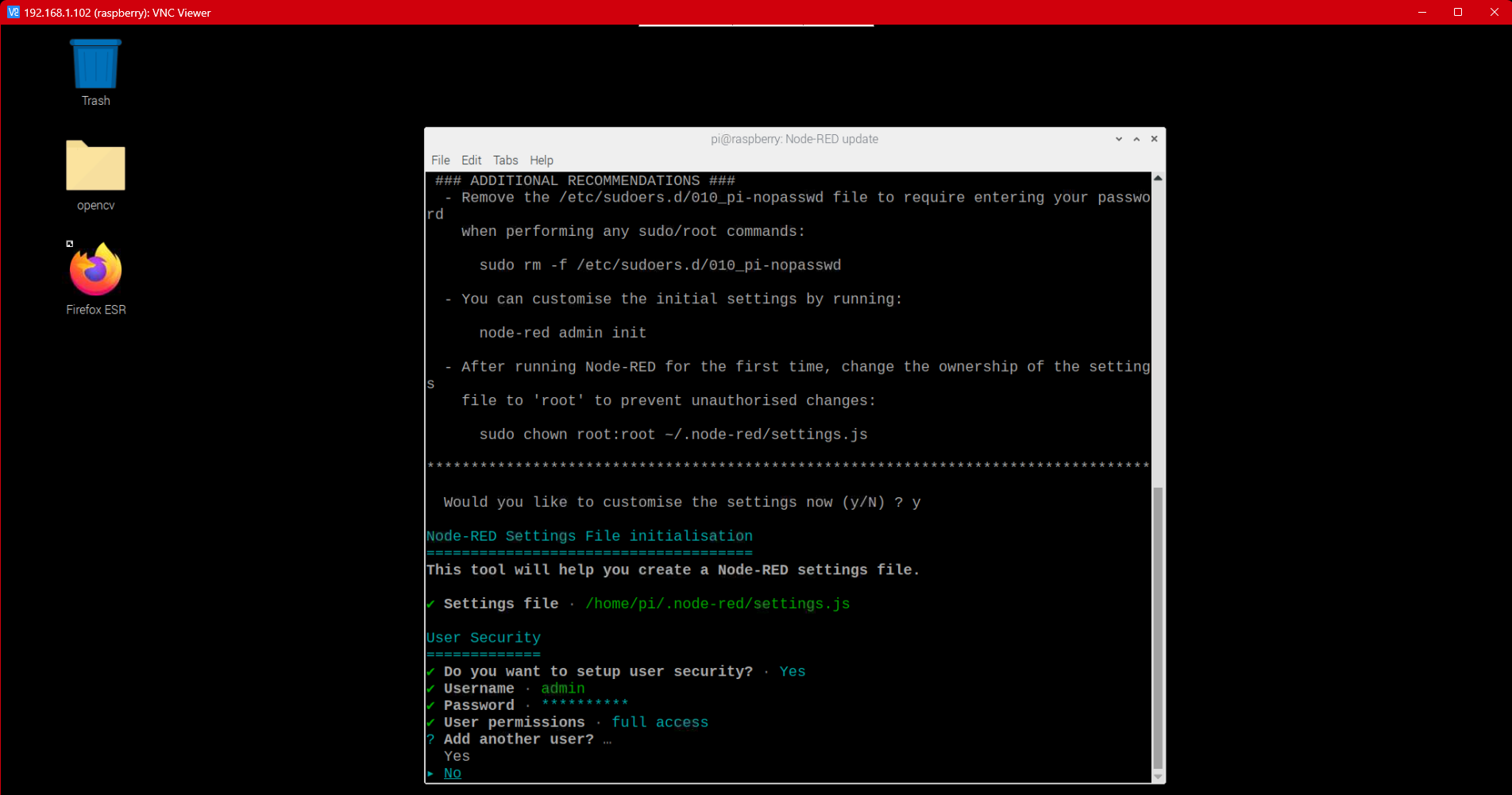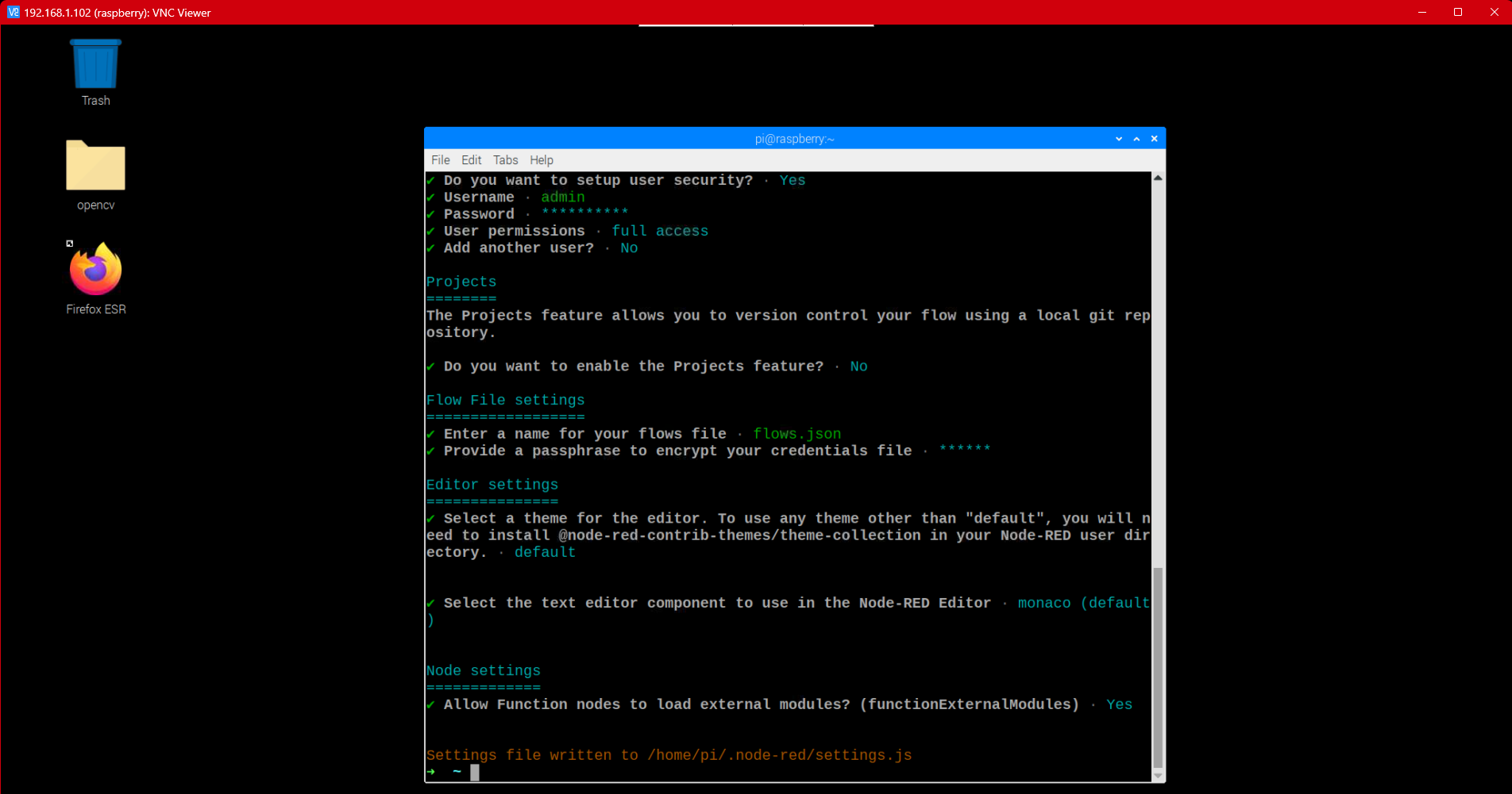 - Press Enter to create a Node-RED Settings file on /home/pi/.node-red/settings.js
