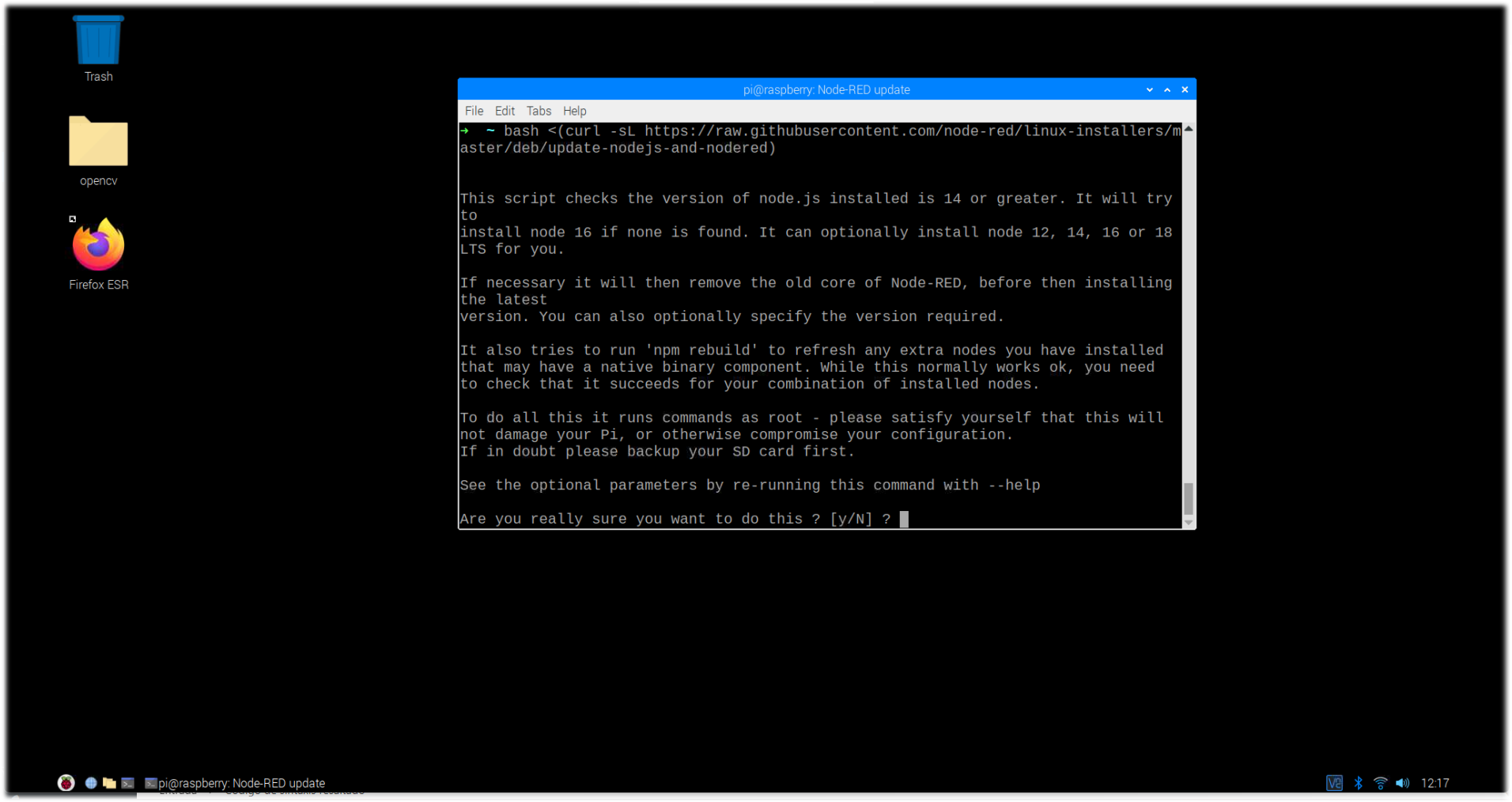 Preguntará si se quiere instalar Node Red, luego preguntará: “Would you like to install Pi-specific nodes?” Presionar Y, luego Enter.